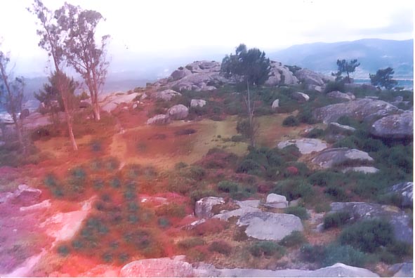 | La construcción se emplaza en una especie de pequeño cordal rocoso, a modo de espolón, de los varios que posee la Sierra del Galiñeiro, cerrando el valle del Louro por el O. De hecho, el monumento se encuentra a 480 m. de altitud sobre el nivel del mar, mientras que el mencionado valle fluvial, no se alza más allá del centenar de metros. La estructura se sitúa precisamente casi sobre la rompiente. El cordal rocoso que le alberga avanza en dirección SE., siendo de escasas proporciones en su plano superior (aproximadamente mide 1 km. de longitud por no más de 100 m. de anchura, en el mejor de los casos). Como ya queda indicado, el entorno es sumamente rocoso. En líneas generales cabe señalar hacia el NO. una serie de bajas alturas constituidas por batolitos graníticos a base de peñascos separados por espacios pavimentados con lajas, y salpicados con pequeñas zonas libres de roquedo donde crecen reducidas capas herbáceas, si bien la potencia de la capa de humus sigue siendo deficiente. Hacia el SE. aparece una especie de terraza más baja donde se aprecia ya cierta abundancia de espacios cubiertos de vegetación, aunque de todos modos, dadas las condiciones geológicas del entorno, no pasa de ser testimonial, y para concluir, el espolón se resuelve en otra pequeña altura rocosa que constituye ya el remate SE., donde años atrás se instaló una caseta de vigilancia forestal. Aunque a esta serranía menor se puede acceder a través de un cómodo y ancho camino procedente de la carretera que del lugar de Prado (Morgadáns) asciende la Aloia, sin embargo, la circulación por el lugar en estudio debe realizarse a pie, por entre los roquedos, no existiendo más que senderos abiertos por el constante deambular del ganado que pace en la zona. | ||||||||||||||||||