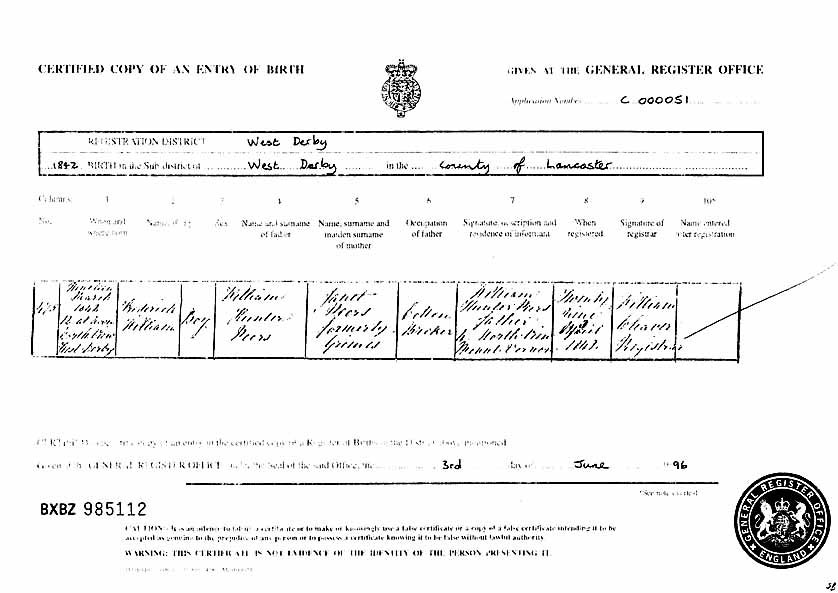 full English birth certificate, below reads: