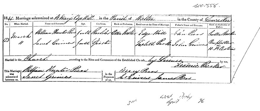 Marriage certificate of William Hunter Peers 1844 to Janert GRIMES