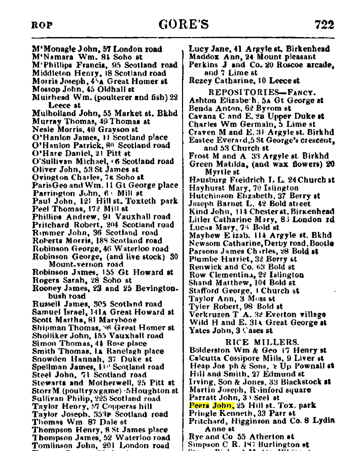 PEERS, WILLIAM,STORE KEEPER,GREAT NELSON STREET NORTH,LIVERPOOL,S &