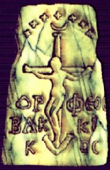 Debieron de haber muchísimas, innumerables, representaciones de Bako crucificado en la antigüedad así como de otros dioses paganos. El ejemplo del que hablamos se descubrió en un tiempo reciente. Es igual si pertenece al siglo III o al menos III porque lo que evidencia es de que no se trata de Jesucristo sino de un dios pagano más antiguo que se encuentra crucificado como posteriormente fue representado Jesucristo (eso independiente de que el símbolo de la cruz por sí mismo es casi universal). Los símbolos de una media luna y 7 estrellas sobre la cruz no son símbolos cristianos. Además figura claramente inscrito el nombre del dios en ese quizá amuleto. Por contra, creo que no se han hallado representaciones de Cristo crucificado en los primeros siglos del cristianismo (como tú bien dices al principio se utilizaba el símbolo del pez), sino que comienza a representarsele así precisamente cuando Bako es perseguido y destruidas sus figuraciones y su culto. Cristo hereda así a partir de entonces la postura de Bako clavado en una cruz. Aunque todo esto por supuesto fue censurado por la Iglesia. Cristo es una suma