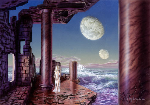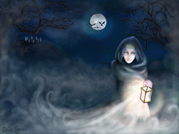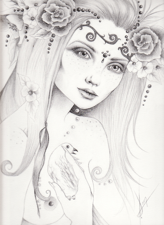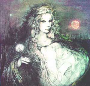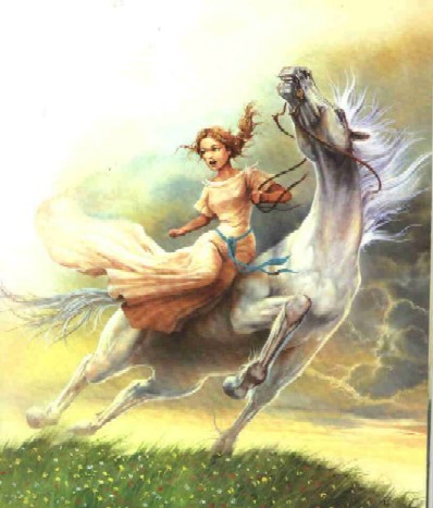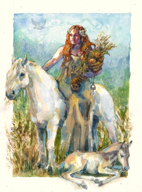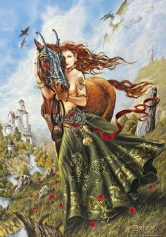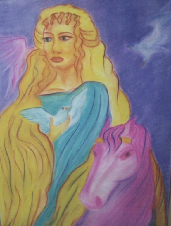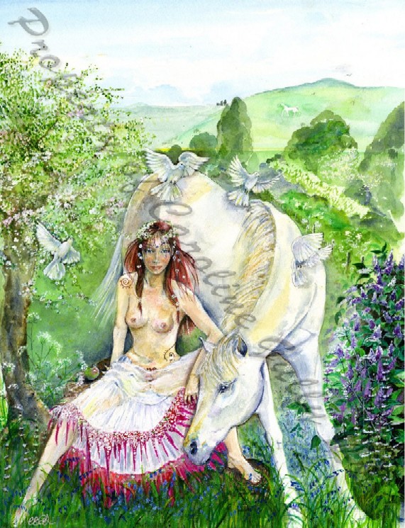 Dos cuadros de Rhiannon, con sus animales totémicos. Sus largos cabellos se confunden con los del caballo.