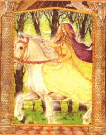 recreación de Rhiannon montada sobre una yegua y acompañada de sus pájaros