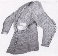 waist down. there is a great fullness of fabric above the waist while the hips are almost tightly covered. Perhaps this snug lower body acted as a foundation to which the legs were attached. Note that the aventail is tied to the gambeson. |