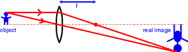 A real image is formed when light rays originating from a point on one side of a lens (i.e. the object) are refracted by the lens so that they focus (come together) to a point on the other side of the lens at the image location. This happens when the object is father away from the (converging) lens than the focal length.