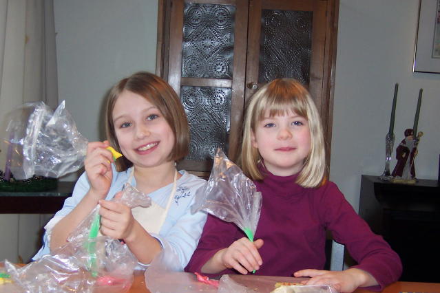 | Me and my best friend, Helene are icing our Christmas cookies. We really don't get to see each other very often, we only play together about 6 times a week. ;-) As you can see, just the day before I got my hair cut! |