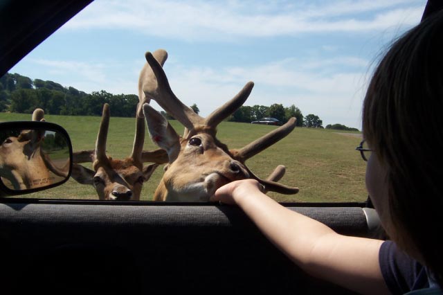 | On another day when Ralph was working, Karen and the kids went to Longleat which is an estate that has been turned into an animal park. You are able to drive your car right through areas with wild aninmals such as lions. In one section you could feed the deer out of your car. There were lots of things to see and do including a train, a maze, a playground, and the Longleat House, which was built in 1568. This was probably the favorite day of the trip for the kids. |