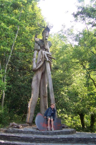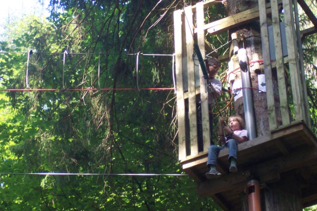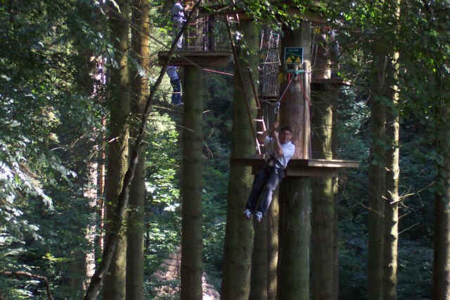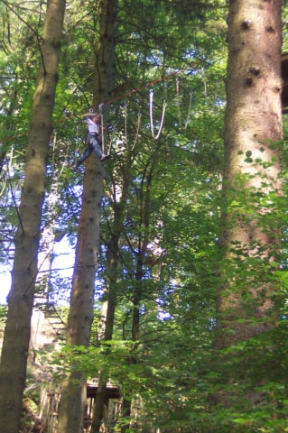 | One thing that Ralph and Rachel enjoyed doing was the Go Ape! ropes course in Grizedale Forest section of the Lake District. It was Rachel's idea. She was just old enough and just tall enough, but she was plenty strong enough and courageous enough. It was as high as 60 feet off the ground in places. The best part was the zip lines like the one Ralph is on just below on the right. |