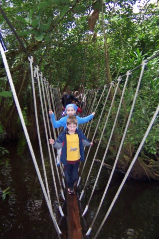 | We had a really good zoo day in Arnhem. The zoo has traditional animal habitats, including an aquarium, as well as some unique ones. We really enjoyed the time spent here in "The Bush" where birds and small animals sometimes crossed our path. The kids really liked crossing this bridge which barely kept them above water. Click check out the zoo on-line. |