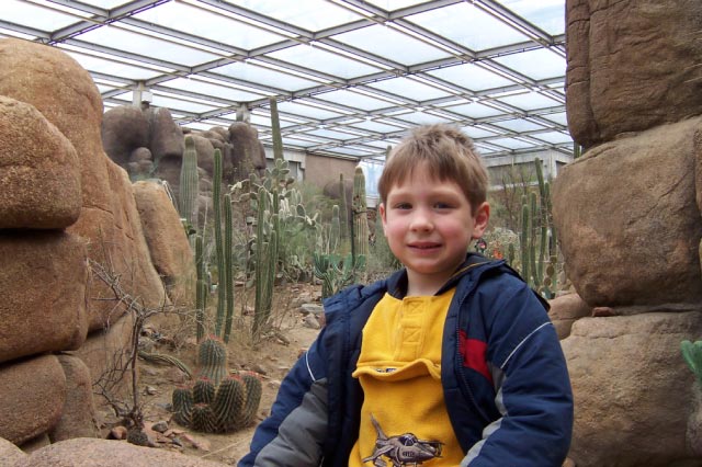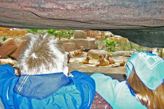 | Right and below are some views of "Burger's Desert". It was not too hot in this man made environment in March as they change the temperature to match the cycle of the American Southwest. There were reptiles, rodents, the rams at right and many birds including a large hawk that enjoyed gliding over our heads as it flew between two perches. |