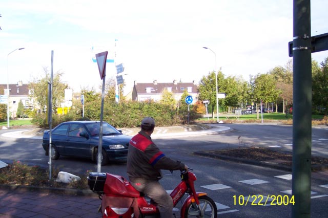 | There are many traffic circles here. They are a great alternative to 4-way stops! The red motorbike here is a postal carrier. It is often easier to bike than drive places. Karen can go to the grocery and home for a hand basket of items in about thirty minutes. Parking is the toughest thing as spaces are tight and most often of the straight-in variety. It usually takes several adjustments to fit the van. |