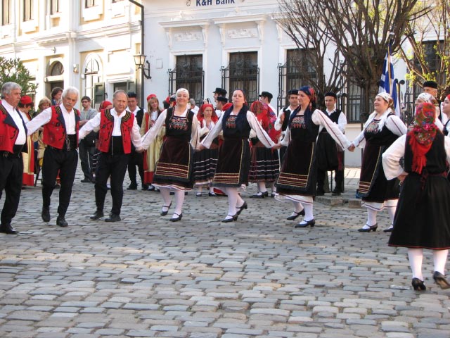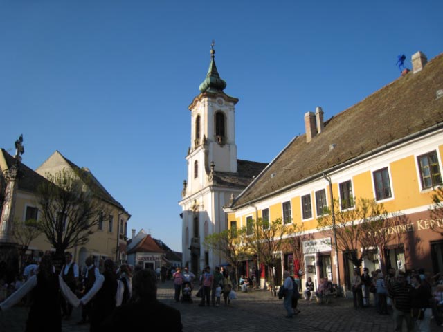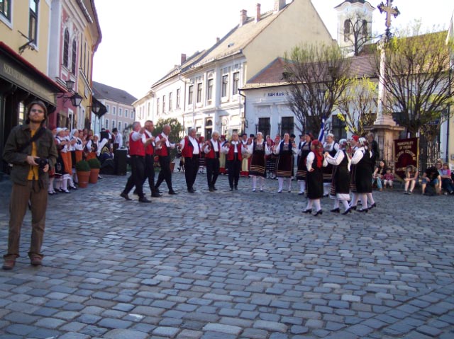 | Szentendre is a quaint artists village not far from Budapest. We happened to be there on Orthodox Easter. Greek and Serbian Orthodox folk musicians and dancers paraded to the main square and provided a concert and dancing. |