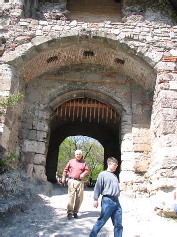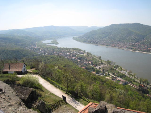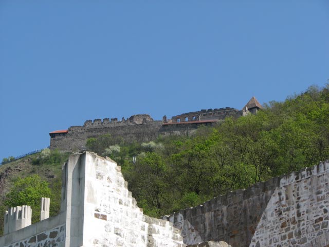 | The Visegrad Castle was built in the 1300s. It was sacked by the Mongols and later the Habsburgs. All trace of the castle was lost until archaeologists found it in 1934. Apparently portions were rebuilt since then. Top left is the view of the Danube from the castle. Top right is how the castle appears from the plain below it, where remains from another royal residence from the 1300s stand. To the left is a shot taken from just outside the castle wall. To the right is the gate that leads to the castle. |