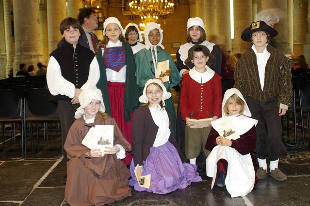 | Dec 3, 2006. Ralph's work has slowed down a little since our last posting. On Thanksgiving the kids participated again in the annual service at the Pieterskerk (St. Peters Church) in Leiden (where the Pilgrims worshipped before they headed for America). Rachel is dressed up as a pilgrim (center, left). It looks pretty likely now that we will get to stay here until the summer of 2008. After that Ralph expects to become a civilian and Karen hopes to return to nursing. |