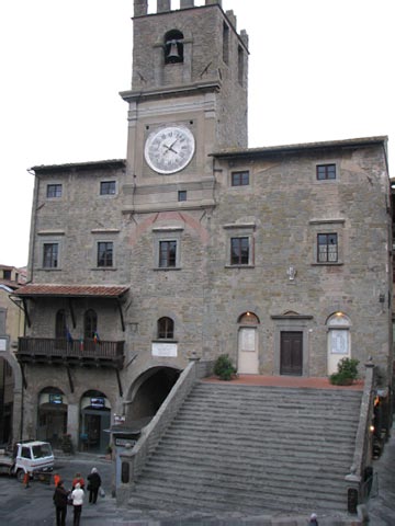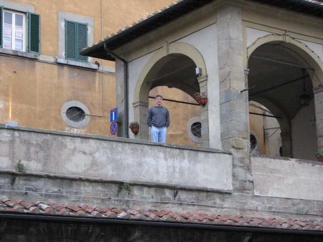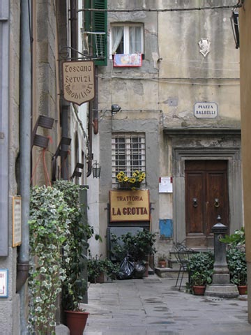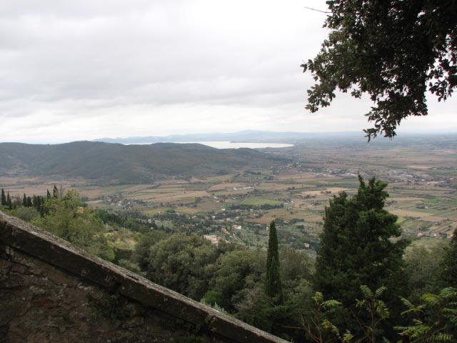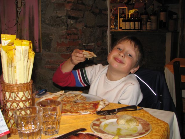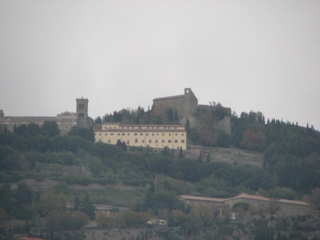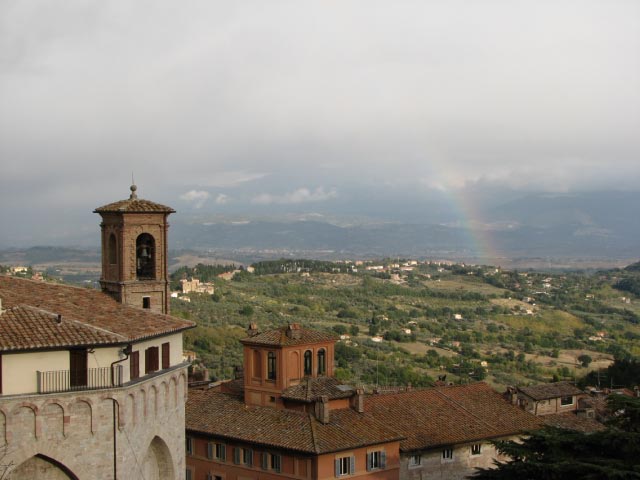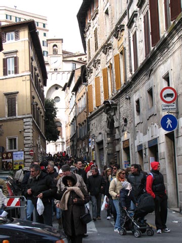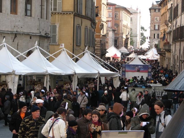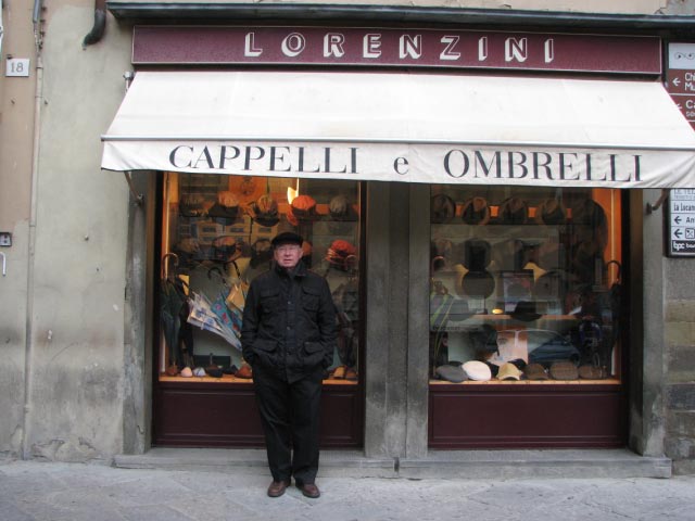 | On Sunday we found a little hill town, Monterchi, that had a small disappointing open air market but did have an open grocery store. We then drove to the chocolate festival in Perugia. On the way we saw a man walking down a country road walking or actually shooing his ducks as he walked to keep them moving and off the road. It was a peculiar sight. It was crowded and cold at the chocolate festival and Ralph's Dad had to buy a fancy new Italian coat (that we later learned was actually made in the US, go figure). Nonetheless, Perugia was a beautiful city. We saw a fun marching band and drank thick hot chocolate. On Monday, we visited a bakery in Mercatale and then headed to beautiful Cortona (bottom section). In Cortona, we had a fantastic lunch and gelato (Italian ice cream). |