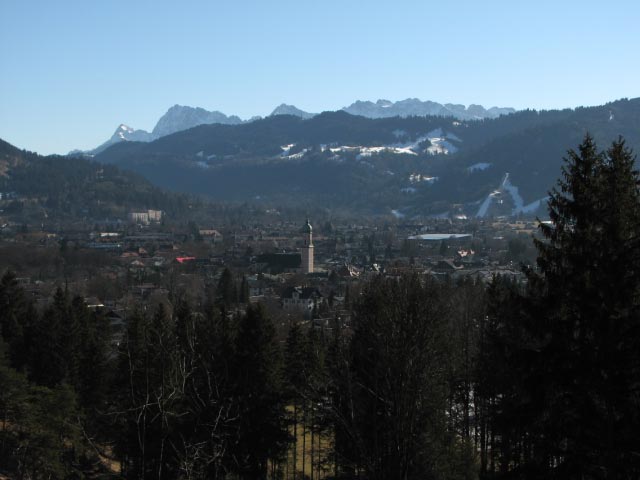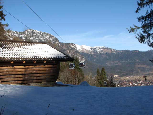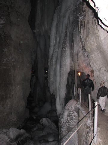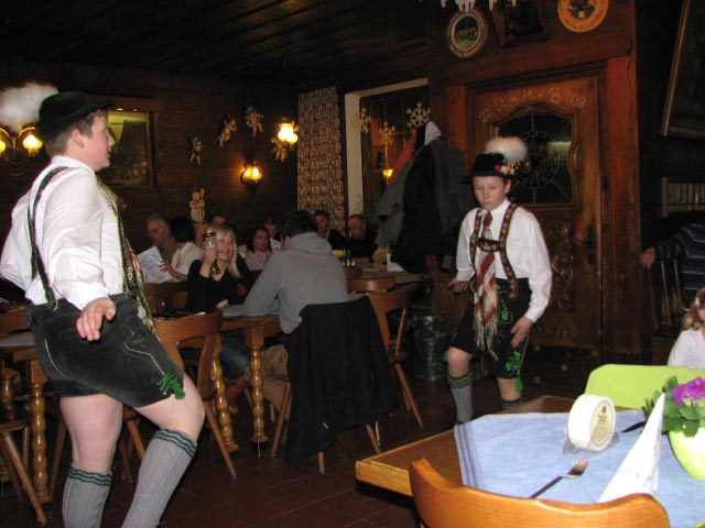 | We also enjoyed a few local attractions. One evening we took a torch light walk in the Partnacht Gorge. The water was still rushing below while the walls were covered in ice. Walking in the dark by torch light had a real "Lord of the Rings" feel to it. We ended the walk by visiting a local restaurant for a very welcome hot beverage! We also had a dinner one evening with most of the families from Ralph's office that were on the ski trip for a traditional German meal complete with accordian player and the dancers below. |