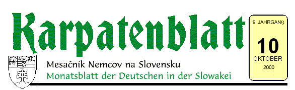KARPATENBLATT, herausgegeben vom Landesvorstand des Karpaten-deutschen Vereins in der Slowakei. Zur Herausgabe des Blattes trägt das Kulturministerium der SR mit einer zweckgebundenen Dotation bei. Anschrift der Redaktion: Karpatenblatt, redakcia, Námestie sv. Egídia 55/50, 058 01 Poprad, Telefon und Fax: (092) 7724 217, Anrufbeantworter (092) 7721 765. Die Interessen des Herausgebers vertritt der Redaktionsrat, Vorsitzende Dipl. Ing. Bartolomej Eiben. Schriftleiter Mgr. Vladimír Majovský. Das Blatt erscheint einmal im Monat. Verbreitet durch die Ortsgemeinschaften des Karpaten-deutschen Vereins in der Slowakei. Die Beiträge geben die Meinung der Verfa sser, nicht immer die des Herausgebers und der Redaktion wieder. Auswahl und Kürzungen sind von der Redaktion erforderlich. Redaktionsschluß am 6. Tag jedes Monats. Abonnentenpreis: 96 Sk im Jahr (Postgebühr einbezogen) - predplatné zasla� pošt. poukážkou typu “C" na adresu redakcie, osobitná prihláška nie je nutná. Für die KDV-Mitglieder ist der Bezugspreis bei kollektiver Abnahme mittels der OG KDV 48,- Sk.