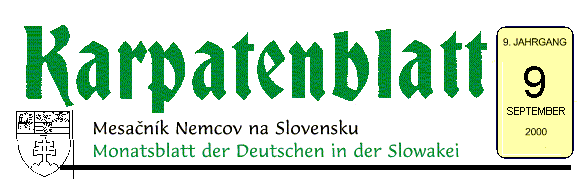 KARPATENBLATT, herausgegeben vom Landesvorstand des Karpaten-deutschen Vereins in der Slowakei. Zur Herausgabe des Blattes trägt das Kulturministerium der SR mit einer zweckgebundenen Dotation bei. Anschrift der Redaktion: Karpatenblatt, redakcia, Námestie sv. Egídia 55/50, 058 01 Poprad, Telefon und Fax: (092) 7724 217, Anrufbeantworter (092) 7721 765. Die Interessen des Herausgebers vertritt der Redaktionsrat, Vorsitzende Dipl. Ing. Bartolomej Eiben. Schriftleiter Mgr. Vladimír Majovský. Das Blatt erscheint einmal im Monat. Verbreitet durch die Ortsgemeinschaften des Karpaten-deutschen Vereins in der Slowakei. Die Beiträge geben die Meinung der Verfa sser, nicht immer die des Herausgebers und der Redaktion wieder. Auswahl und Kürzungen sind von der Redaktion erforderlich. Redaktionsschluß am 6. Tag jedes Monats. Abonnentenpreis: 96 Sk im Jahr (Postgebühr einbezogen) - predplatné zasla? pošt. poukážkou typu “C" na adresu redakcie, osobitná prihláška nie je nutná. Für die KDV-Mitglieder ist der Bezugspreis bei kollektiver Abnahme mittels der OG KDV 48,- Sk. |