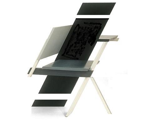 Ook doen wij aan herontwerpen. Zo hebben wij bijvoorbeeld Rietvelds Berlijnse Stoel door de zeef van het herontwerp gehaald. Het resultaat ziet u rechts. De stoel is nu een gemakkelijke stoel geworden voor schuine mensen. De rugleuning is postmodern in drie�n verdeeld. Het onderste deel (onderdeel) en bovenste deel (bovendeel) zijn vrij zwevende elementen geworden. Het middendeel van de rugleuning is voorzien van een nauwelijks zichtbare abstracte figuratie. |
