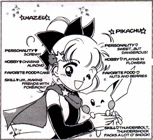 Hazel and Pikachu!! Hazel is an energetic young girl. Pikachu is the first Pokemon Hazel ever "caught". Hazel loves Almond, and her rival for Almond's attention is Coconut. Pikachu is very cute, but when it gets mad it uses its electrical attacks!!