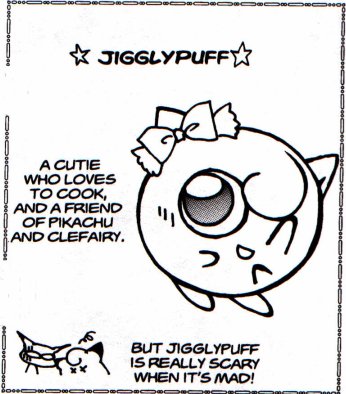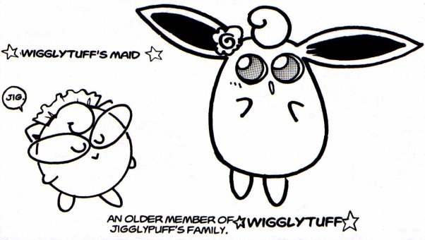Jigglypuff is almost always happy. Hazel met it when it invited everyone to a cute cute party where it had baked lots of treats for its friends, but they only ended up making everyone sick. Jigglypuff is very rich and it gets treated like a princess all the time. When it gets mad, it puffs itself up very big. Its sister is Wigglytuff, who is one of Squirtle's friends.