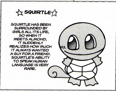 Squirtle considers Almond its big brother and wants to be just like him someday. Almond gave Squirtle a wooden airplane for Christmas and that made Squirtle very happy, because it only had girls for friends before. Squirtle once fought a giant Onix to save its friends. It lives with Hazel and Pikachu. Uhh, what else is there to say? I dunno.