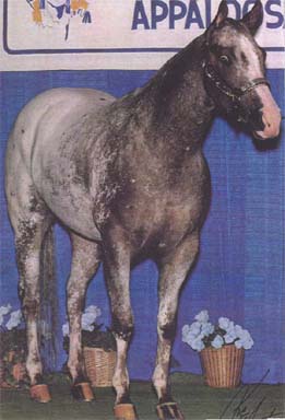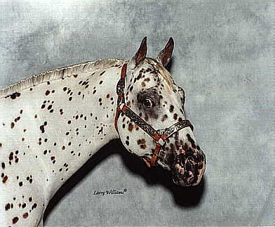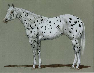 When you drive by a pasture full of horses, i you like o play "identify that breed," the Appaloosa will likely be your winning point. for most people, the Appaloosa is the easiest horse to spot due to its distinctive coat patterns. What some people fail to realize, however, is that Appaloosas have other identifiable characteristics as well. That's more, Appaloosa coat patterns come in infinite variety-from no spots at all, to more sprots than you can count. Some Appaloosas even have spots on their spots! Certain Appaloosas have white "blankets," which look like a covering of fresh fallen snow over their backs, loins, or hips. Som Appaloosas are described as "leapords," with Dalmatian-like spots. There are Appaloosa roans, and any number of spotting combinations.