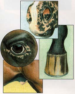 There are also three other visible traits that contribute to the Appaloos'a unique appearance. One is the irregularly pigmented or "mottled" skin which is most apparent around the horse's muzzle, eyes and genitals. Also, many Appaloosas have a distinctly human-looking eye due to the white sclera surrounding the iris, the dark-colored center portion of the eye. Also, you may notice that many Appaloosas have vertical stripes on their hooves in the absence of white leg markings. An Appaloosa need only have mottled skin and one other visible characteristic for "regular" registration status. Above is a picture of the characteristics.