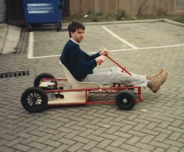| Rob and I built this simple kart in the Winter of 1990 just as we were starting the electric car project. It was built to investigate direct drive to the front wheels and as a half size model of the real thing. More to the point, it was fun to ride and got us motivated in the main project. | ||||||||||||||||||||||