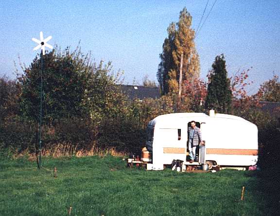 | I met Nick in early October 1995 at a weekend Stirling engine conference in Worcestershire. I later visited Nick at the 2 acre site he and his partner had recently aquired. Home, initially was a 16' caravan, and this included living accomodation, sleeping area, cooking area, wood burning stove and office - complete with phone, fax and Apple Mac! Nick is a consultant and author on sustainable development techniques specialising in water practices, in particular the treatment of waste water using natural reed beds. At this time, Nick was reliant on wind generated electricity from the small Aerogen turbine on the left, a small amount of photovoltaic power, power storage in some 100Ah leisure type batteries and propane for cooking.. The computer, fax and lighting was either dc powered directly or through a small inverter. During my stay, there was a severe frost overnight, and temperatures fell to about -7 centigrade. The pot-bellied wood stove provided almost instant heat and retained a little warmth for comfort whilst we retired to bed. The next day we were met with bright sunshine on a crisp Autumnal morning. |