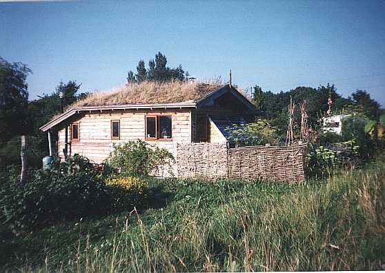 | This is the site a couple of years later - August 1997 and Nick's living accomodation has enlarged somewhat to a two room chalet with a turf roof. The turf acts as an insulator, keeping the heat in in winter and preventing the chalet getting too hot in summer. Note the photovoltaic panel propped up against the wall. |