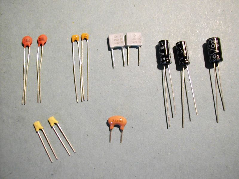| Then there are the Capacitors: 2 off 10nF 50V ceramic 2 off 100nF 50V ceramic 2 off 10nF 250V 2 off 10uF 16V electrolytic 1 off 220uF 16V electrolytic 2 off 22pF silver mica |