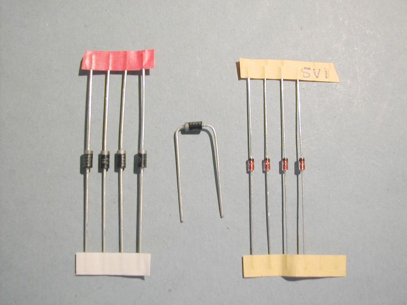 | These are the diodes which make up the bridge rectifier, which forms the line connection. 5 off 1N4004 1A 400V rectifier diodes Also shown are the zener diodes used for voltage clamping and protection 4 off BZX79C-5V1 |