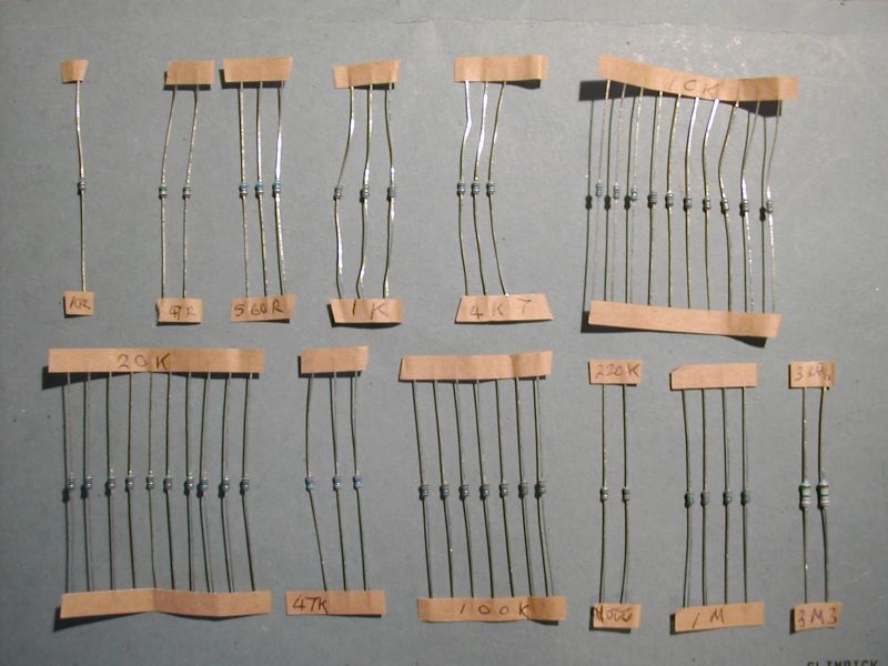| First of all the resistors. 1 off 10R 2 off 47R 3 off 560R 3 off 1K 3 off 4K7 10 off 10K 10 off 20K 7 off 100K 2 off 220K 4 off 1M 2 off 3M3 |