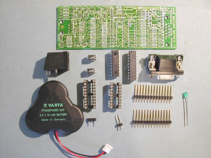 Here are the remaining parts: Double sided PTH pcb size 108 x 39 mm RJ11 phone line connector 2 off KP1010 optocouplers PIC16F88 microcontroller with RAT firmware 8 Bit latch (optional) 9 way D-type connector for PC_Serial link IC DIL sockets 20 pin and 18 pin 14 way SIL headers for expansion connectors LED - shown green here Socket for ceramic resonator or crystal Battery Connector 2 pin 3.6V NiMH battery (type may vary) |
