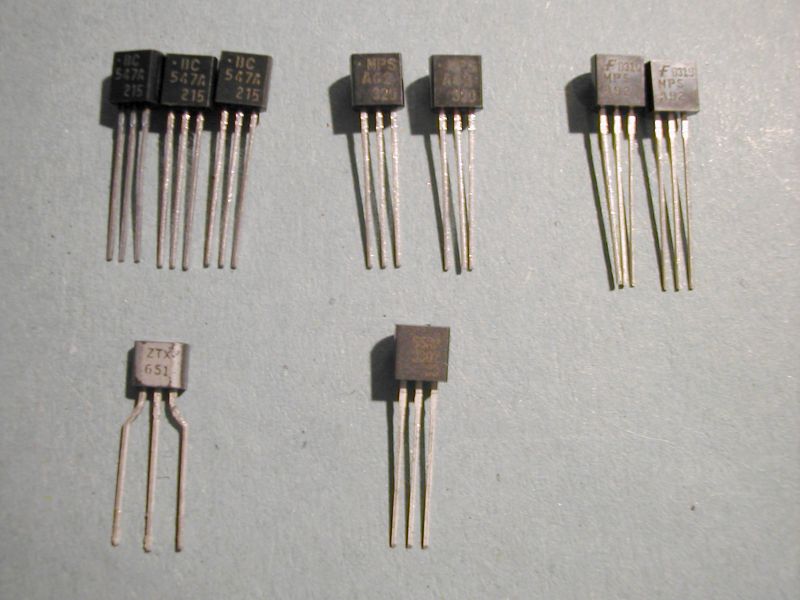 | The transistors from left to right: 3 off BC547 NPN General purpose 4V 2 off MPSA42 NPN high voltage 300V 2 off MPSA92 PNP high voltage 300V 1 off ZTX651 NPN 2A current 1off 3.3V voltage regulator Holtek HT7533 etc |
