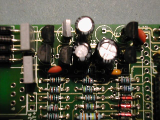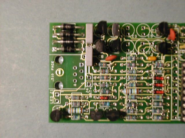 | Step 8. Then fit the MPSA92 devices T1 and T7. They are fitted closest to the top edge of the board. Finally fit T3, noting that it is in a silver E-Line package and should be fitted with its curved side facing the diodes D1 to D4. |
