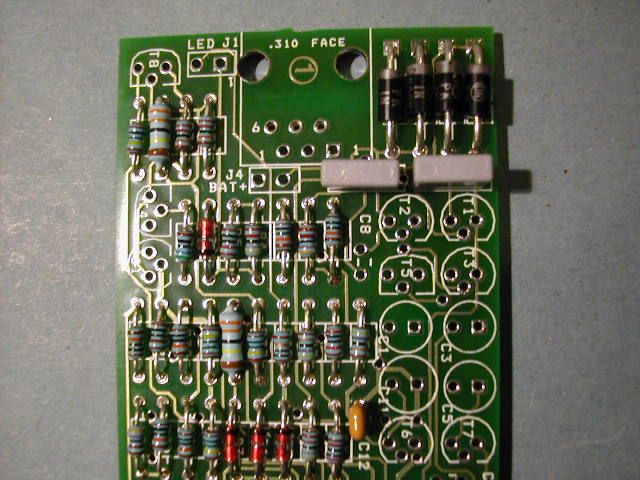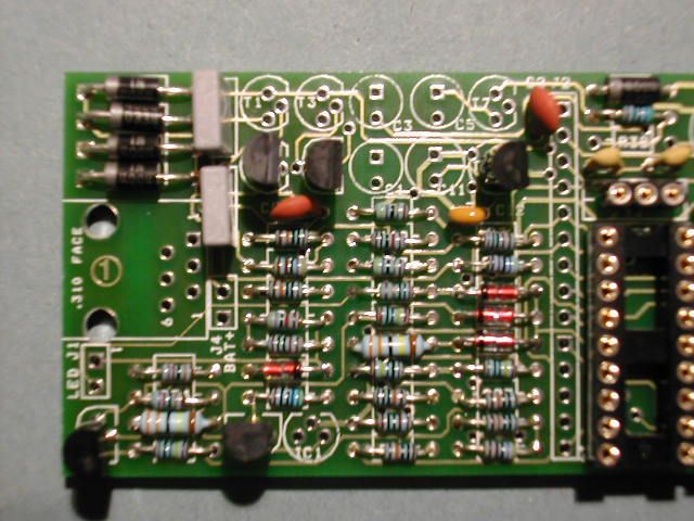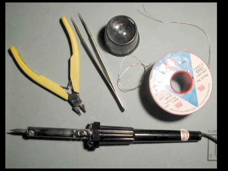 | First you will need a few tools: 1. A fine soldering iron 15 to 30W 2. Resin cored solder 26swg 3. Side cutters 4. Tweezers 5 Perhaps a magnifying glass. The pcb is built up in stages determined by the height of the component. Low lying resistors and diodes first, then transistors, capacitors and the really big stuff, such as connectors, are fitted last. |