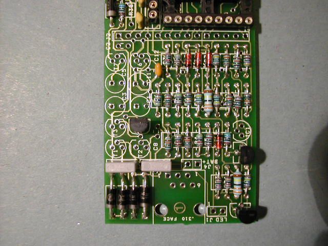 | Step 2. Now begin by fitting all the resistors and diodes Start with the components in the order they appear on the parts list. Bend the resistor leads so that they are the correct pitch for the holes in the board. Insert no more than 10 components at a time and solder from the reverse side of the PCB. Crop the excess component leads close to the board with sidecutters after soldering. Make sure you fit the diodes and zeners in the correct way around. Check D9 carefully |