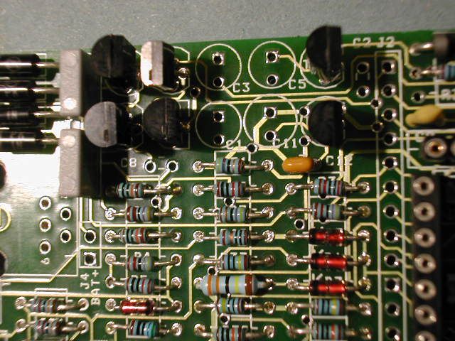 | Fit the BC547 devices first into positions T4, T5 and T8. Check the orientation from the legend. Use the caps C6 and C7 as a guide to set the height of the transistors above the pcb - about 7mm or 0.25" |