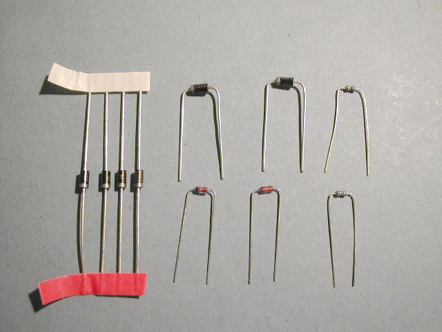 | Ensure that you have all the components ready. Sort them out into resistors, diodes, capacitors, transistors etc. Resistors have been labelled to make reading their value much easier. The resistors and diodes will have to be bent to go into the board. This is best done by grasping the component between thumb and forefinger, positioning the thumbnail 3mm from the end of the component body, then bend the component lead over the thumbnail at 90 degrees. It may take a little practice to get the knack. |