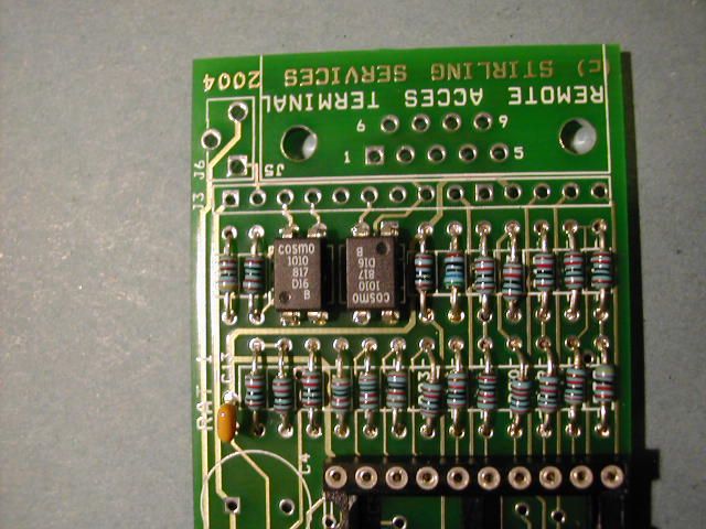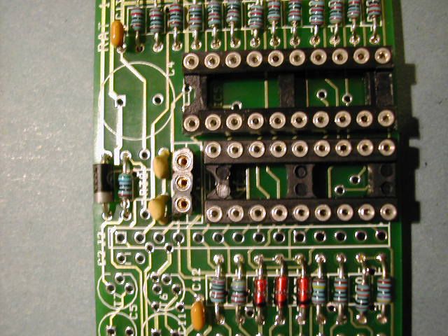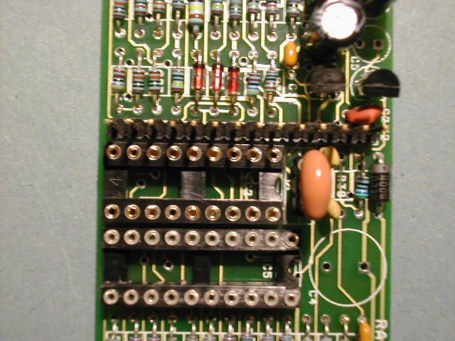 | Step 3. Now fit the two opto-isolators IC3 and IC4. Note that IC3 is fitted "upside down" compared to IC4. Fit the 18 pin DIL socket for the PIC and the 20 way socket for IC5. Fit the 3 pin piece of SIL socket for the crystal resonator - below. |