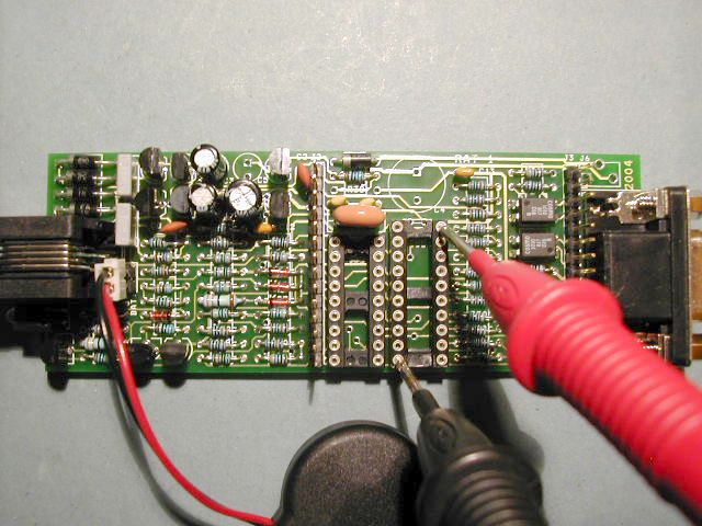 | We now use a DVM (multimeter) to check that there is 3.3V coming from the regulator. Put the probes on Pin 10 and Pin 20 of IC5 as shown. Also check that the battery voltage is about 3.6V or else the battery may need to be charged. |