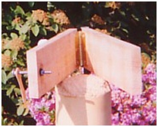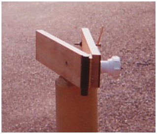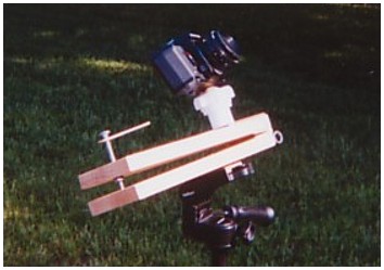 | This manual barn door mount was made straight from the instructions on R. Duvall's Barn Door Tracker web page. My polar finder is a piece of 1/4 inch scrap brass plumber tube. In an effort to innovate a bit, I placed cross-hairs on the end and covered them with a small lens I cut out of a piece of optical acrylic. I have not found the cross-hairs to be functional, however, as without some kind of LED illumination they cannot be seen against the night sky. |
