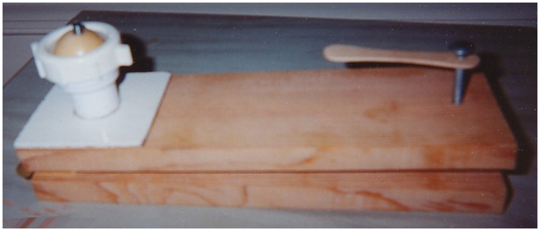 | The popsicle stick (use a big one from a Dove ice cream bar) turns a 3 inch x 1/4 inch carriage bolt. The nut on the underside is held in place with silicone glue. |