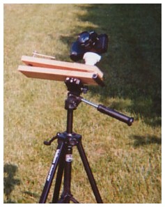 | The parts for the manual mount cost only a few dollars. A small square of masonite with a hole cut to size helps keep the plastic housing glued in place. I glued the screw in the wood-ball after carefully measuring it to ensure that the protruding end screws all the way in to the base of the camera. |