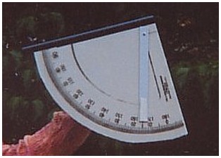 I then cut the second transparency to fit and glued it on by the edges. I screwed a 3/8inch wide flat metal strip to the quadrant at the interstection of 0 degrees and 90 degrees and attached a small rod to the tip of the flat strip to get a more accurate reading. Although it is not shown in any of my pictures, I also cut a piece of an old leather belt to make a loop strap which is glued to the back of the quadrant for ease in holding. The sight tube on top is a 1/4 inch diameter plastic tube I had in my scrap box. |
