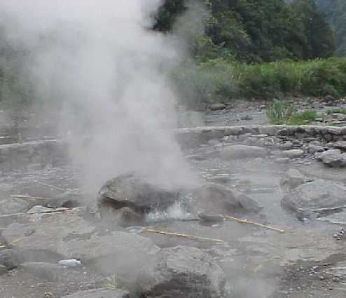 Here, boiling water and steam come bubbling out of the rocks on a riverbed next to a small stream.