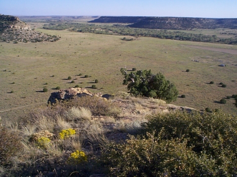Three-quarters of a mile south from the point of black mesa lay a small jut of rocks he named robbers roost peak. This is where he and half-dozen specially- recruited men built his outlaw headquarters. They built a 16x36 foot house with stone walls 30 inches thick. It had one door and no windows. Instead, there were 27 portholes, 4 inches open to the outside and 18 to 20 inches on the inside. This made for a small target on the outside and plenty of room to maneuver a rifle on the inside. There were two large fireplaces inside, one on each end of the house. There was believed to be a fully stocked bar, a piano, and loose women from new Mexico and Colorado.