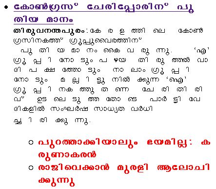 the most respectable news media! The other two news items were on Murali out of Cong(I) Group and Antony refusing to give Minister Post to Padmaja! These items disappeard from the web pages after a while! [Kerala Kaumudi - 11.2.2000] Similar news about Congress infighting also appeared in the old Cong Newspaper Mathrubhumi.
